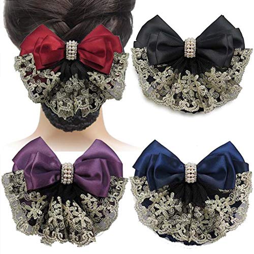 Specifications: Color: Purple/Black/Blue Clip Length: 10cm/3.94 inch Bow Size: 12 x 10.5cm/4.72 x 4.14inch Material: Lace, Satin Ribbon, Steel Spring Clip Package includes: 2Pcs Bow Barrette Hairnet Features: Helps fix your hair and keep it clean and tidy. Classic all-match, can match your uniform, dress or company dress at work or school. The perfect hair accessory can look elegant and formal in any occasion. It is an exquisite gift for yourself and friends. It is also the best choice for professional women such as hotel attendants, flight attendants, bank staff, and nurses.
