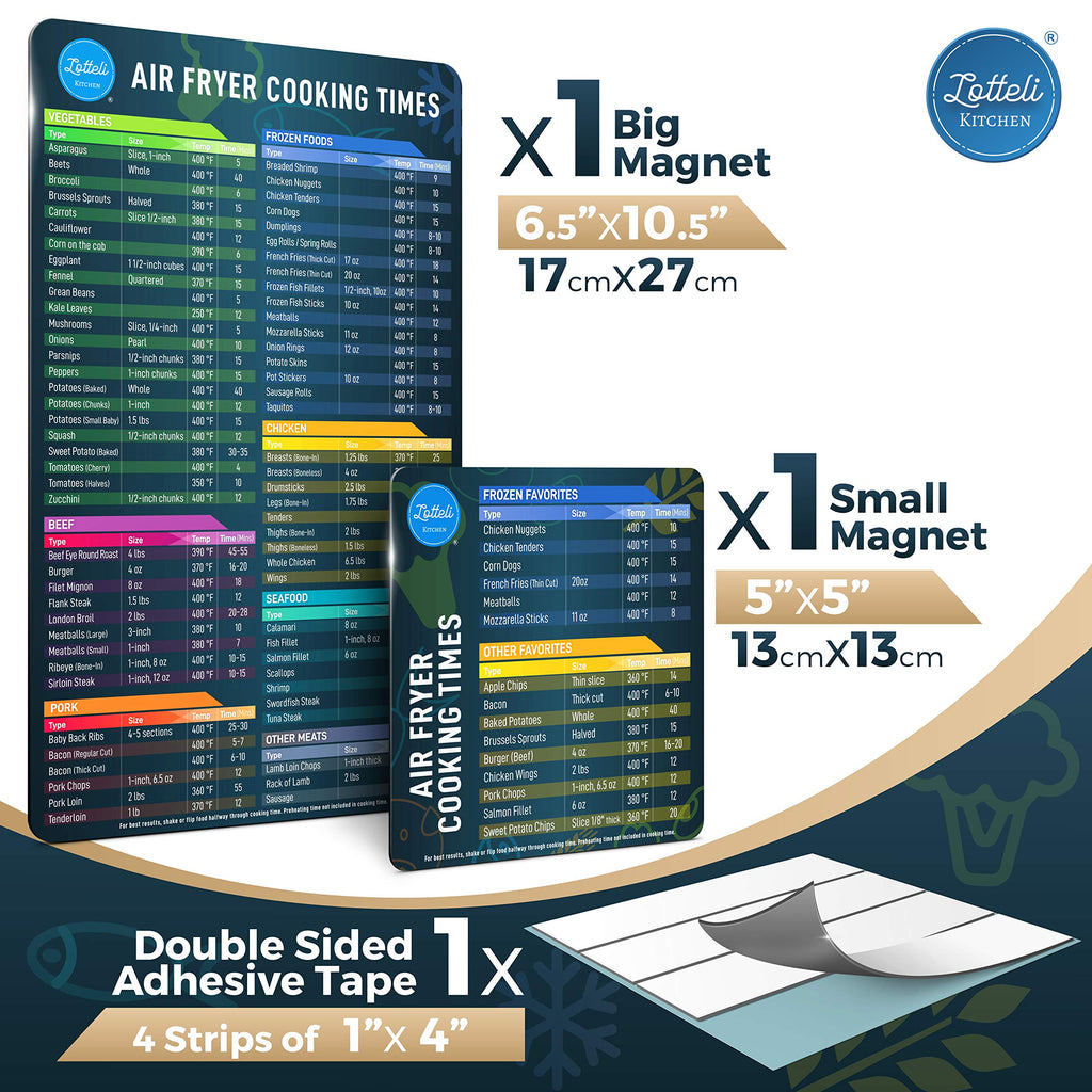 Master Your Air Fryer Cook book & Make Delicious Meals The Whole Family Can Enjoy With LOTTELI KITCHEN magnetic air fryer cheat sheet! If you want to make finger-licking good fried food the easy way, then air fryers are the way to go! This is why we designed our air fryer book to provide you with a simple and no-hassle way to perfectly fry all your favorite foods without worrying! With this air fryer recipe book quick reference guide magnets set you never have to worry about undercooking or overcooking again! They feature accurate and precise temperature and time for cooking all your favorite food to make sure they always come out perfectly crisp and crunchy. Exact Times & Temps So You Can Cheat Your Way To Deliciousness! sheets Each pack comes with 2 cheat sheet magnets accessories for air fryer that show the exact frying times for over 100 common foods including Vegetables, Beef, Pork, Frozen Foods, Chicken, Seafood, and more so you can save time and effortlessly, making this on your kitchen essentials list. Everything is printed on durable and sturdy materials with powerful magnetic backs using easy to read letters to make finding the food you want to fry even faster and simpler. Just stick them on any magnetic surface and youre done - its that simple. Dont have a magnetic surface? Dont worry, make use of the double-sided heat-resistant tape included for your convenience. More Features Youll Love; Suitable for most air fryers on the market! Large easy to read font makes sure you can read it from any angle Just the right size for refrigerators so you can glance at it anytime Strong magnet backing makes sure it stays securely and firmly in place. Bonus double-sided heat resistance tape included Laminated surface to protect from oils and accidental spills