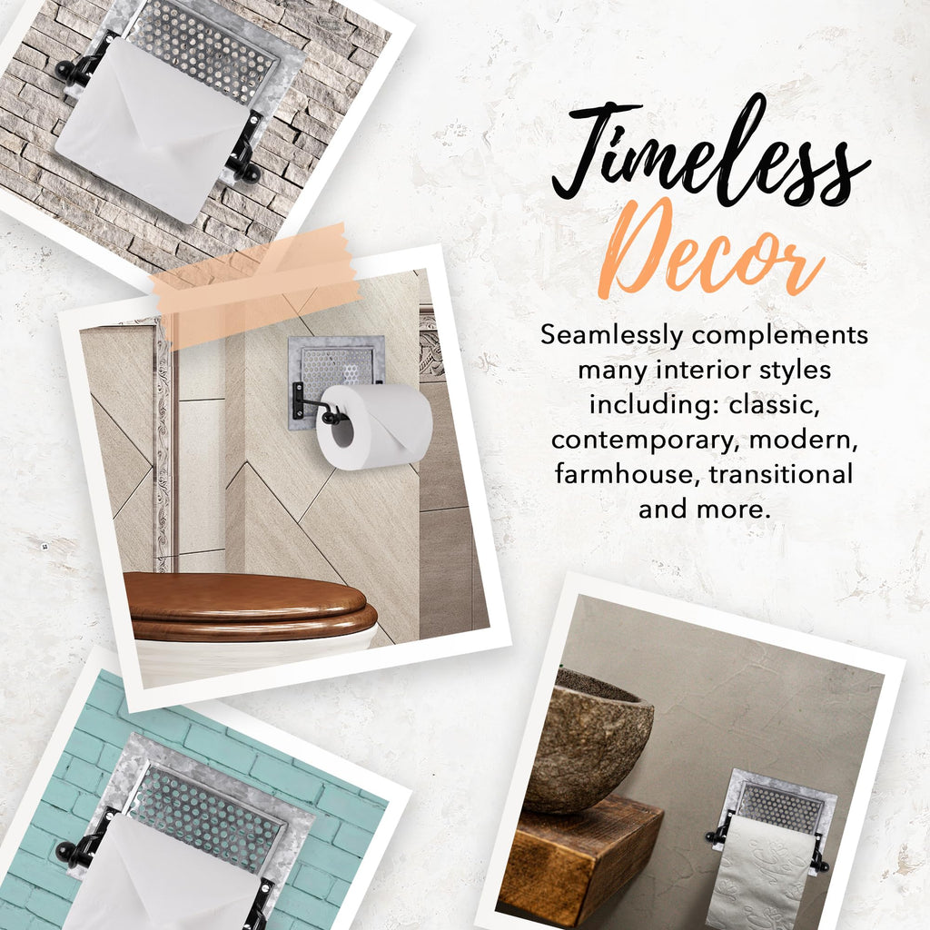 This sturdy holder adds a splash of functional farmhouse charm to your bathroom. The simple design makes this piece a timeless classic. The mixed metals and perforated inset just up the farmhouse feel another notch. Pair it with other galvanized pieces from Autumn Alley to complete the look.