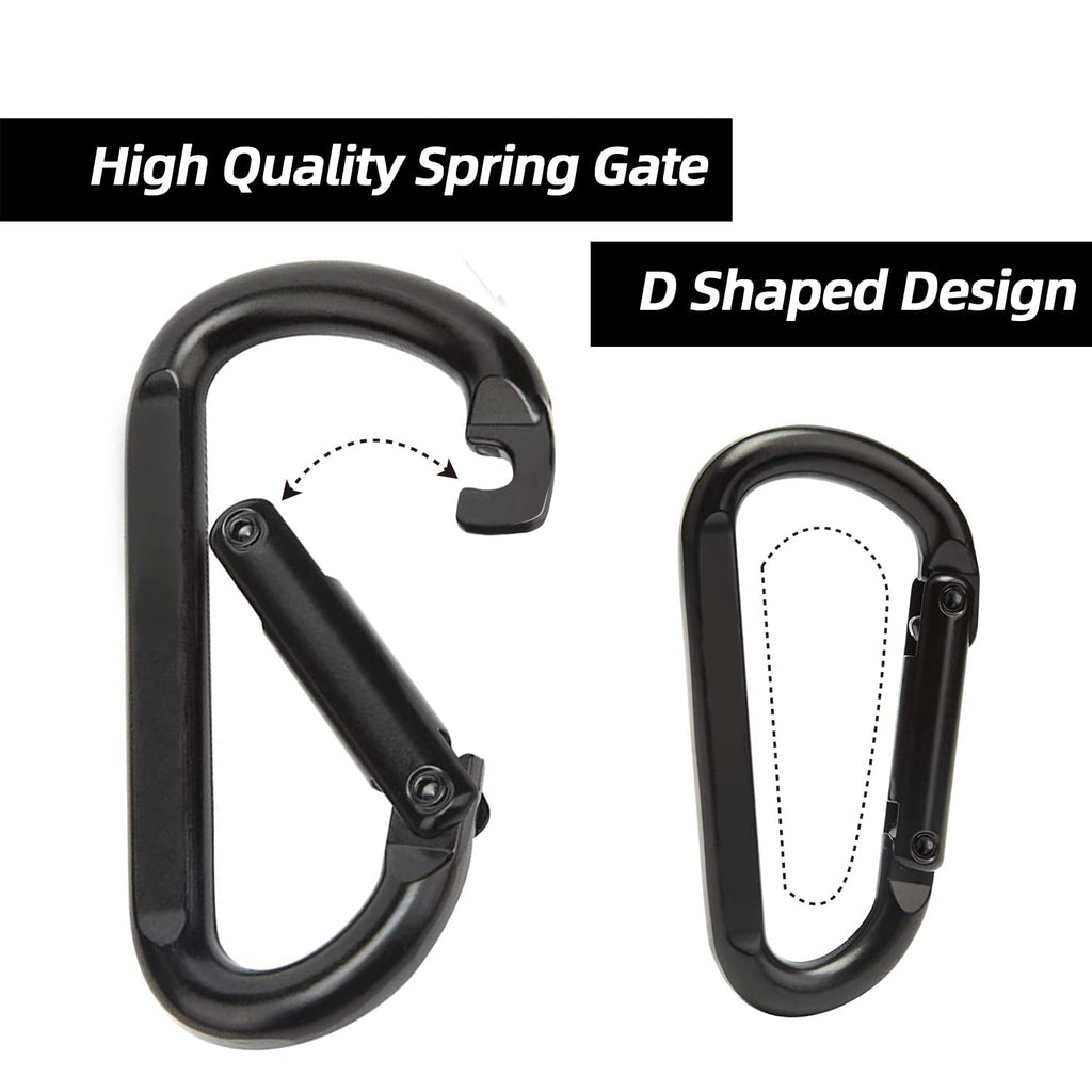 Size Size: 3 inch, makes it handy and easy to carry Color: Black Heavy Duty Carabiners Material: Made from superior Waterproof, wear-resistant, high strength, durable alloy metal material. Process: Electrophoretic paint Maximum static load: 860lbs / 390kg(fully off mode) Premium Spring Clip: Premium carabiner springs allow them to be quickly and safely fixed to various fixing points.