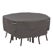 Product Descriptionthe Ravenna Table And Chair Covers From Classic Accessories Combine A Striking Style With Durability, Fade-Resistance And Convenient Features. Reinforced Padded Handles Make Removal Easy While Double-Stitched Seams Add Strength And A Stylish Accent. Structured Vents Stay Open To Prevent Wind Lofting And Are Lined With Mesh Barriers. Patent Pending.Please Refer To Your Furnitureas Care Instructions As Some Finishes, Sealants Or Coatings Could React To Pvc Backed Covers. To Reduce This Possibility, The Use Of A Support Pole (Sold Separately) Is Recommended To Elevate The Cover. Our Covers Are Not Intended For Furniture Made Of Concrete..Comravenna Table And Chair Set Coversthe Ravenna Table And Chair Covers From Classic Accessories Combine A Striking Style With Durability, Fade-Resistance And Convenient Features. Reinforced Padded Handles Make Removal Easy While Double-Stitched Seams Add Strength And A Stylish Accent. Structured Vents Stay Open To Prevent Wind Lofting And Mildew And Are Lined With Mesh Barriers. Waterproof Backing Keeps Your Table And Chairs Dry While Elastic Hem Cords Move Easily Through A Special Channel For A Snug Fit. The Adjustable Webbing Belts Slide Easily For A Tailored Look And Four Custom-Colored Buckles Will Keep Your Cover Secure In Any Weather. Striped Webbing Adds An Attractive Accent And Is Unique To The Ravenna Collection. The Cover Is Also Great For Protecting Tables Without Chairs, For Instance If You Have A Place Inside For Your Chairs But The Table Is Too Large To Store Conveniently. Available In Several Sizes To Fit A Variety Of Models, The Ravenna Table And Chair Cover Adds Style To Your Patio And Will Protect Your Table And Chairs For Years. 4-Year Replacement Warranty Through Manufacturer. Patent Pending. Double Topstitching Structured Air Vents Webbed Handles With Extra Padding Attachment System With Belted Channel Hemcord With Advanced Channel Features Reinforced Padded Handles Make Removal Easy While Double-Stitched Seams Add Strength And A Stylish Accent Structured Vents Stay Open To Prevent Wind Lofting And Mildew And Are Lined With Mesh Barriers Waterproof Backing Keeps Your Table And Chairs Dry While Elastic Hem Cords Move Easily Through A Special Channel For A Snug Fit Four (4) Custom-Colored Buckles Keep Your Cover Secure In Any Weather Adjustable Webbing Belts Slide Easily For A Tailored Look Striped Webbing Adds An Attractive Accent And Is Unique To The Ravenna Collection 4-Year Replacement Warranty Through Manufacturer Patent Pendingavailable Sizes & Stylesview Largerview Largerview Largerview Largerchoose The Right Style For Your Patiocollection Ravennaveranda Eliteverandaterrazzovilla Warranty4-Year3-Year3-Year1-Year1-Year Fabric Gardelle One Woven Polyester With Uv Stabilizer Coating And Pvc Backing Gardelle Woven Polyester With Pvc Backing Gardelle Woven Polyester With Pvc Backing Rain-Tite Woven Polyester With Pvc Backing Weatherpro 3-Ply Non-Woven Polypropylene Colordark Taupe Mushroomespresso Claywrought Ironbark Pebblebarkearth Sandbirchwalnut Air Vents Structured With Mesh, Covered Mesh, Covered Mesh, Covered Covered Covered Handles Webbed With Extra Padding Padded Padded - All-Season Protection Uv Protection-- Strapping System Attachment System With Belted Channel Click-Close Strapsclick-Close Straps Elastic Loops Tie-Downs Elastic Hem Toggle With Advanced Hemcord Channel Hemcord With Toggle Hemcord With Togglehemcorners