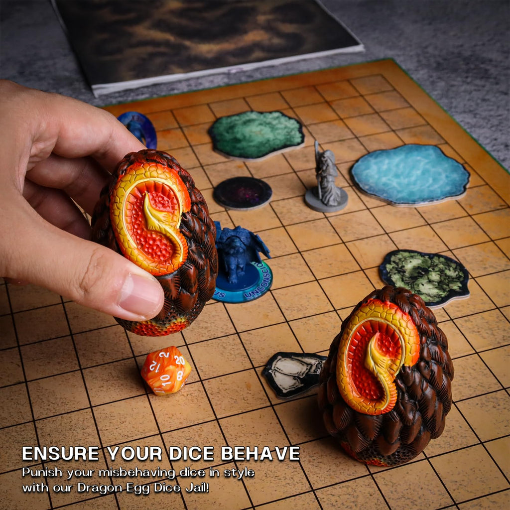Tired of critical fails and misbehaving dice? Our Dragon Egg Dice Jail is the perfect solution for keeping your dice in line during every D&D session. Crafted from premium resin, this set of 2 dice prisons not only serves as a stern dice accessory but also adds a touch of fantasy to your tabletop. Each dragon egg miniature is intricately designed to resemble a mystical dragon egg, making it a captivating D&D accessory that doubles as a dice cage and dice holder. No more cluttered tables or lost dice; these dice prisons keep your game organized and your dice secure. Perfect for any D&D enthusiast, these dragon egg miniatures are a must-have addition to your collection of D&D accessories. Whether you're a dungeon master looking to maintain order or a player wanting to showcase your dice in style, this dice cage is an essential tool for your gaming arsenal. Searching for the ideal dnd gift? Look no further. The Dragon Egg Dice Jail set makes a unique and thoughtful gift for Dungeons and Dragons players, adding both functionality and flair to their gaming experience. Elevate your game, keep your dice in check, and enjoy the mystical allure of these dragon egg miniatures. Make every roll count and every game session unforgettable with this perfect dice accessory.