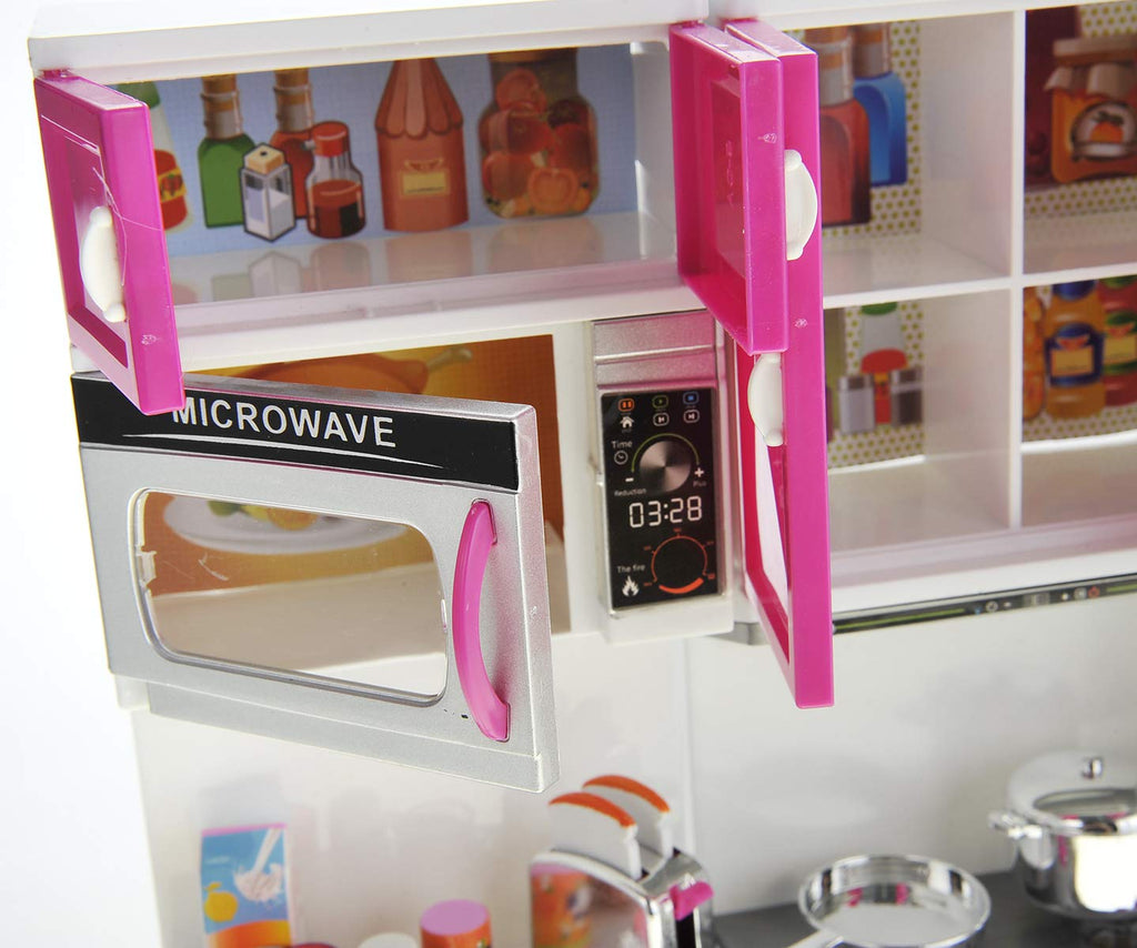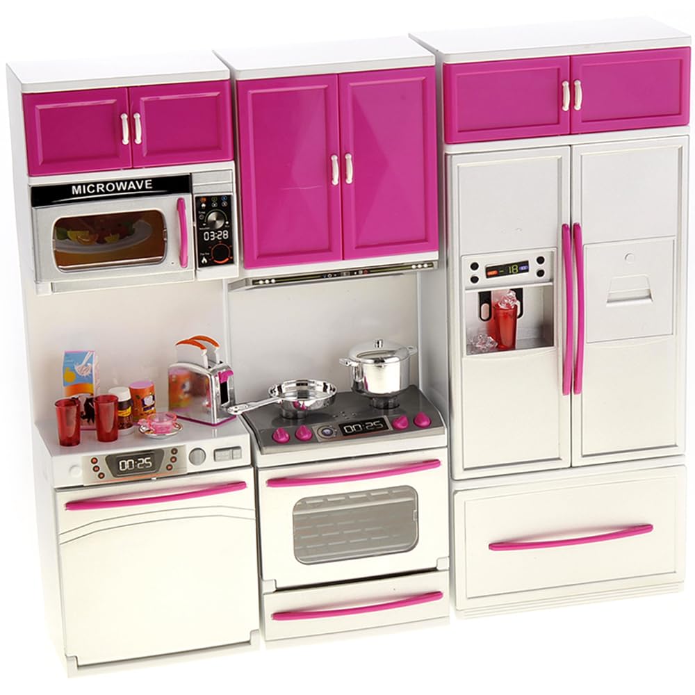 Doll Kitchen Playset, Mini Modern Kitchen Toys Pretend Play Furnitures Toy Sets Accessories Set with Realistic Light & Sound for