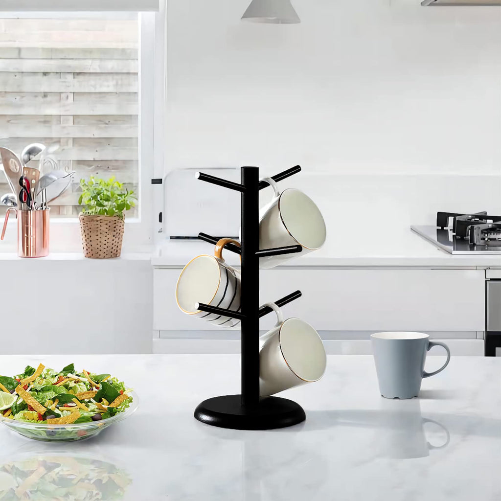 Cup holder wood for your coffee bar, counter,your cabinetMess?No space for organize? Are you puzzled by puzzled by the above question.As a mug hobbyist,the mug you like can't be show,would you like to find a home for it?Large mug,small mug,put it together.Hang them on the treeHere You Come.Our mug tree for counter can solve all these problem for you.Multi-function Mug Holder TreeAccomodate more-Jewelry storage rack,perfect for your dresser.Solid and environmentallyColor:BlackSize:13.6*5.9*5.9Material:Bamboo