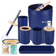 Package Include: 1*toothbrush holder,                                1*toothbrush cup,                                1*soap dispenser,                                 1*soap dish,                                 1*toilet brush holder,                                1*trash can,  Material: Plastic Easy to Assemble and clean Stylish Elegant Design bathroom decor