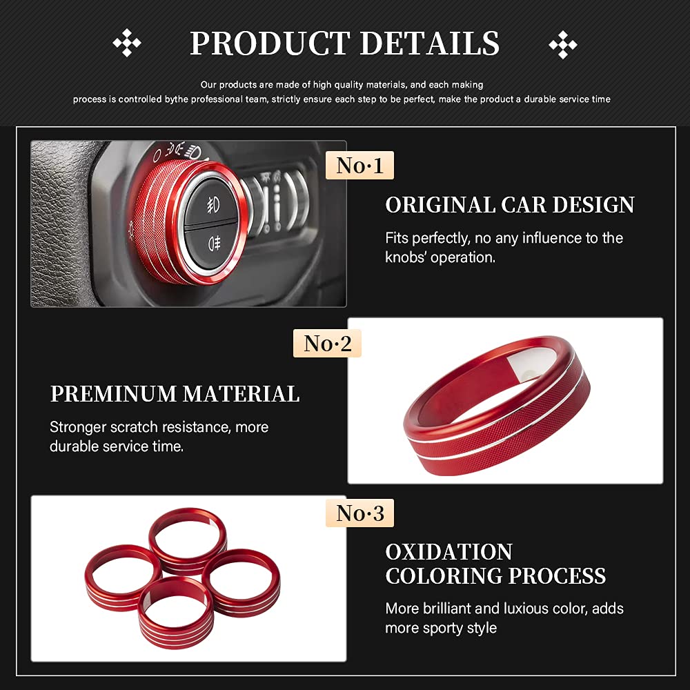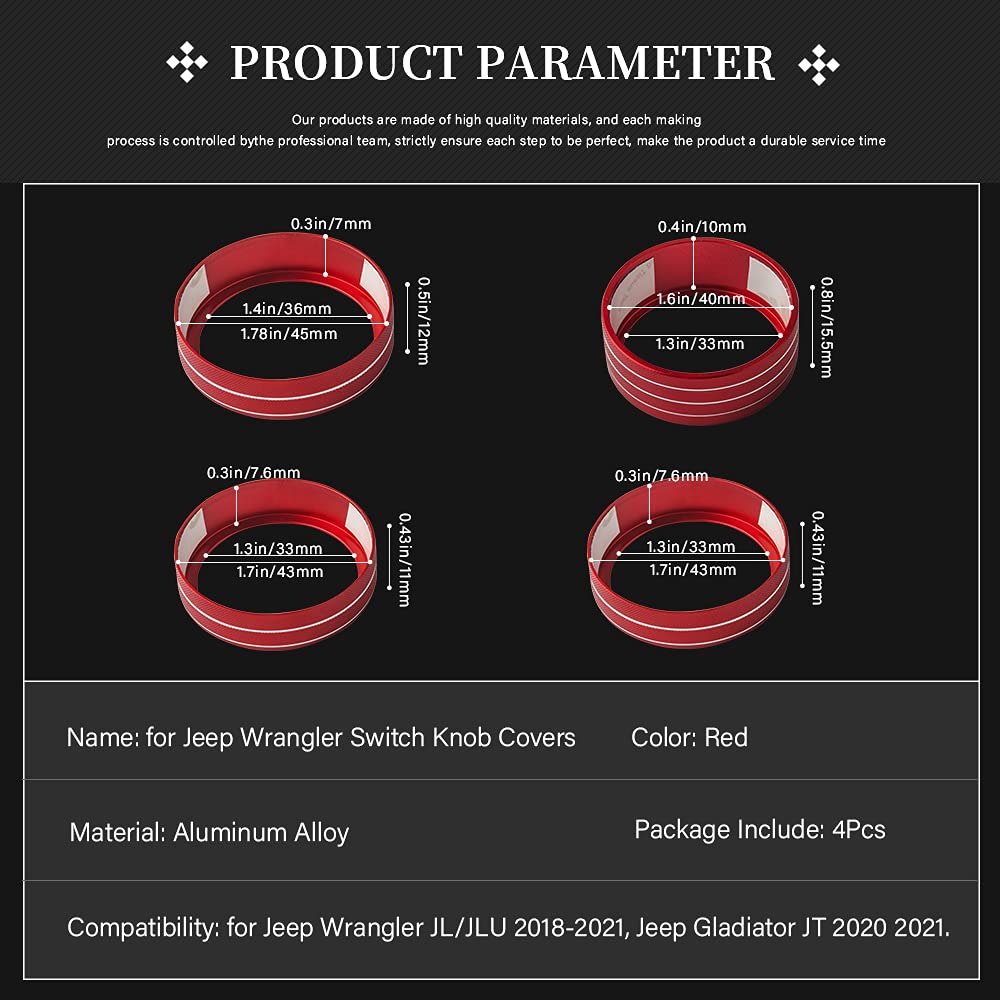 For Jeep Wrangler JL accessories is a great protection & decoration for your car, the metallic red color adds some sporty style & makes the interior of your jeep pop Product Information: Name: For Jeep Wrangler Ac & Headlight Switch Knob covers color: Red Material: Aluminum Alloy Package Include: 4Pcs Switch Knob covers Installation Type: Direct Replacement Fitments: Our red car interior dash trim are compatible: for Jeep Wrangler JL JLU 2018 2019 2020 2021 for Jeep gladiator 2020 2021 Installation Tips: Directly press to the car knobs, no any modifications are needed If the knob covers are too loose to twist, please use the double-sided tape to add traction, then turn the cover caps without slipping Warm Tips: The real color of wrangler jl accessories will be a little different from the picture due to the shooting angle and condition LEcART Worry-free After-sales Service: If there is any product problems, free return is available within 30 days Please go to the AOrder DetailA then click the AReturnA button to apply If itAs over 30 days, but within 365 days, there is a free replacement (one time) available for your order Note: please contact us via the order youve placed Wish you enjoy a good time while shopping in LEcART