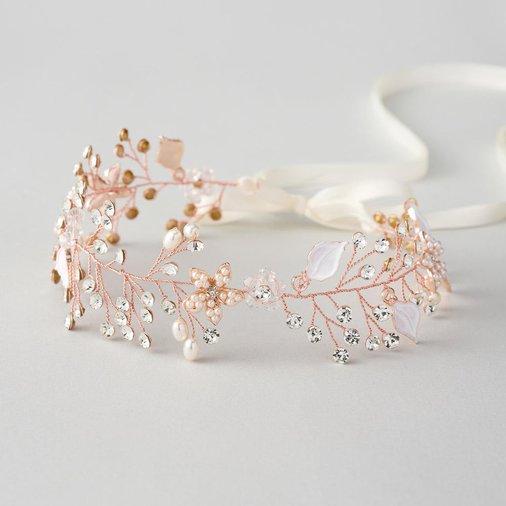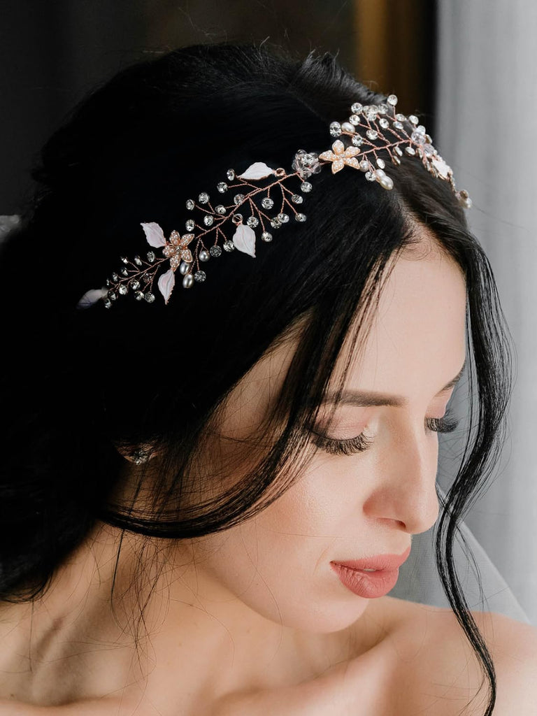 SWEETV Bridal Headband Wedding Headpiece for Bride Hair Accessories for Wedding Hair Pieces Crystal Pearl Hair Vine Rose Gold