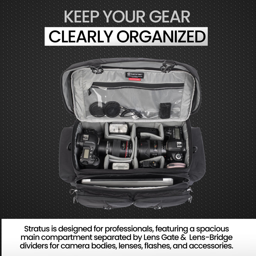 Stratus is designed for the working professional. Each Stratus features a large main compartment, designed to hold multiple camera bodies with lenses attached, along with a full range of lenses, flashes and accessories. Our Lens-Bridge with LensGate dividers create a very efficient use of space while multiple pockets and the included accessory pouches keep your gear organized. Five different sizes allow for the perfect match for your gear.
