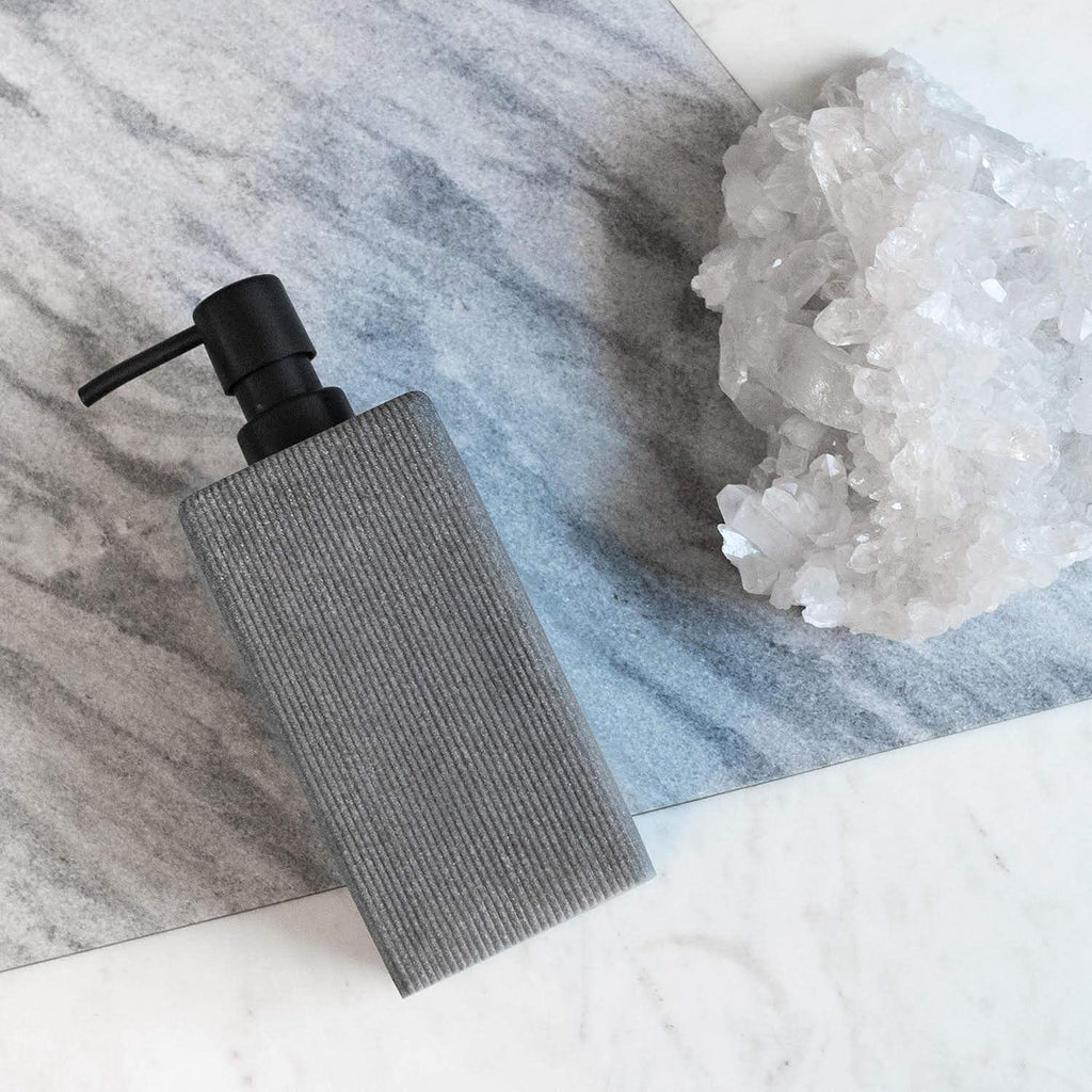 Hand soap dispenser for bathrooms or kitchen use. Stone feel with smooth press pump. Large size soap dispenser by Varato Design.