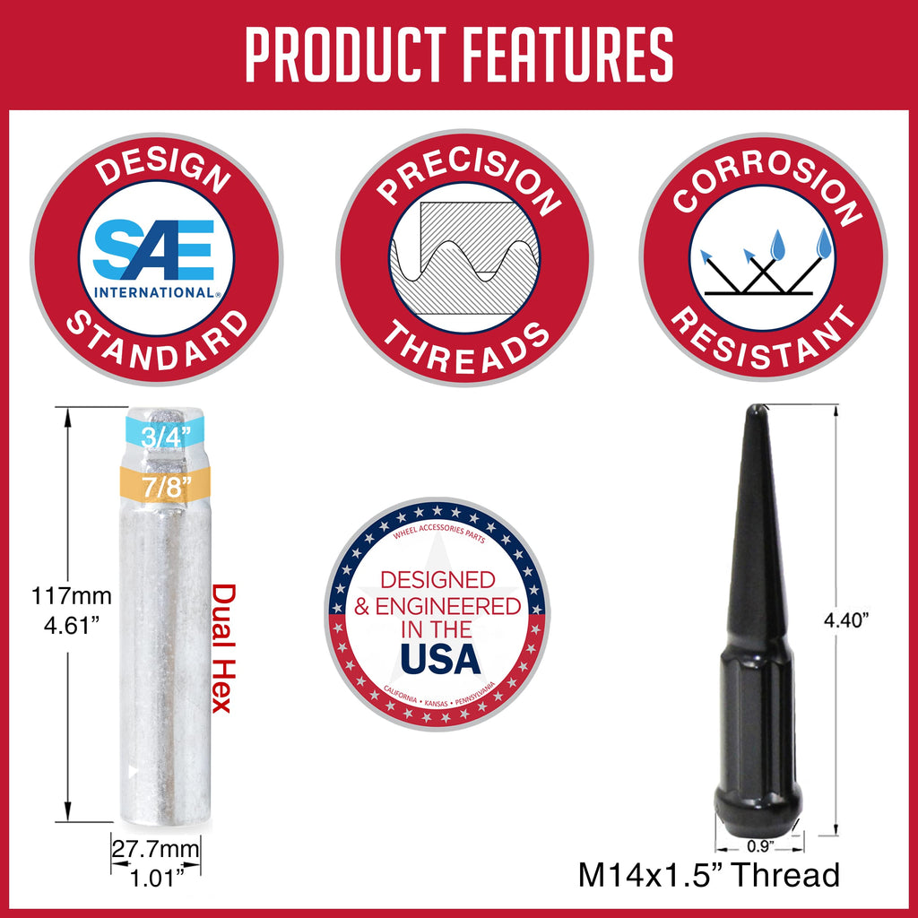 Wheel Accessories Parts 20 Pcs M14 x 1.5 14 x 1.5 Thread Spike Spline Solid Metal 4.40 Long Lug Nuts Black Truck Spline Fits 1990-99 Chevy C1500 | GMC 1500 | RAM 2012-18 1500 | 2019+ 1500 Classic