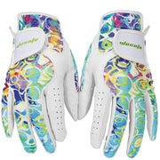 1.Material: The palm of the hand is a soft leather, and the back of the hand is cotton with holes. Very comfortable and skin-friendly, and also very breathable. This is a pair of professional ladies golf gloves. 2.Size: There are various sizes , suitable for almost all women and girls. There detailed size introduction pictures, you can choose the gloves that suit you according to your own palm size. 3.Design: This glove is very reasonable in design. The palm is an ultra-thin soft leather that protects the woman's hand from injury during exercise. The back of the hand is made of soft cotton, which is breathable and absorbs sweat for a more comfortable fit. 4.Color: This golf club glove is very beautiful in color. The overall design is white, with bright color accents, making the whole pair of gloves very eye-catching and very suitable for the simple and elegant color of the sport of golf. 5.Note: This pair of stylish golf gloves is more suitable for hand washing. It is not recommended to use a washing machine. It is best to dry naturally.