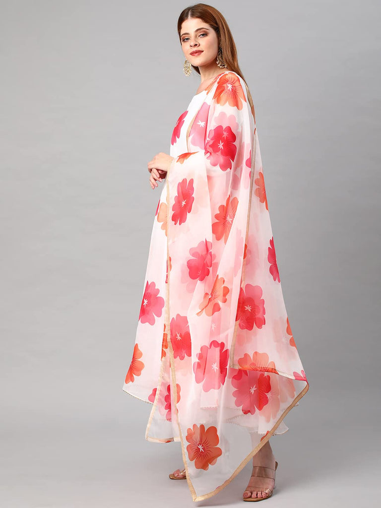 Gosriki Women'S Chanderi Cotton Flowers Printed Anarkali Kurta And Pant With Dupatta Set (Anarkali-White-Nw-Gs_L_White_Large)