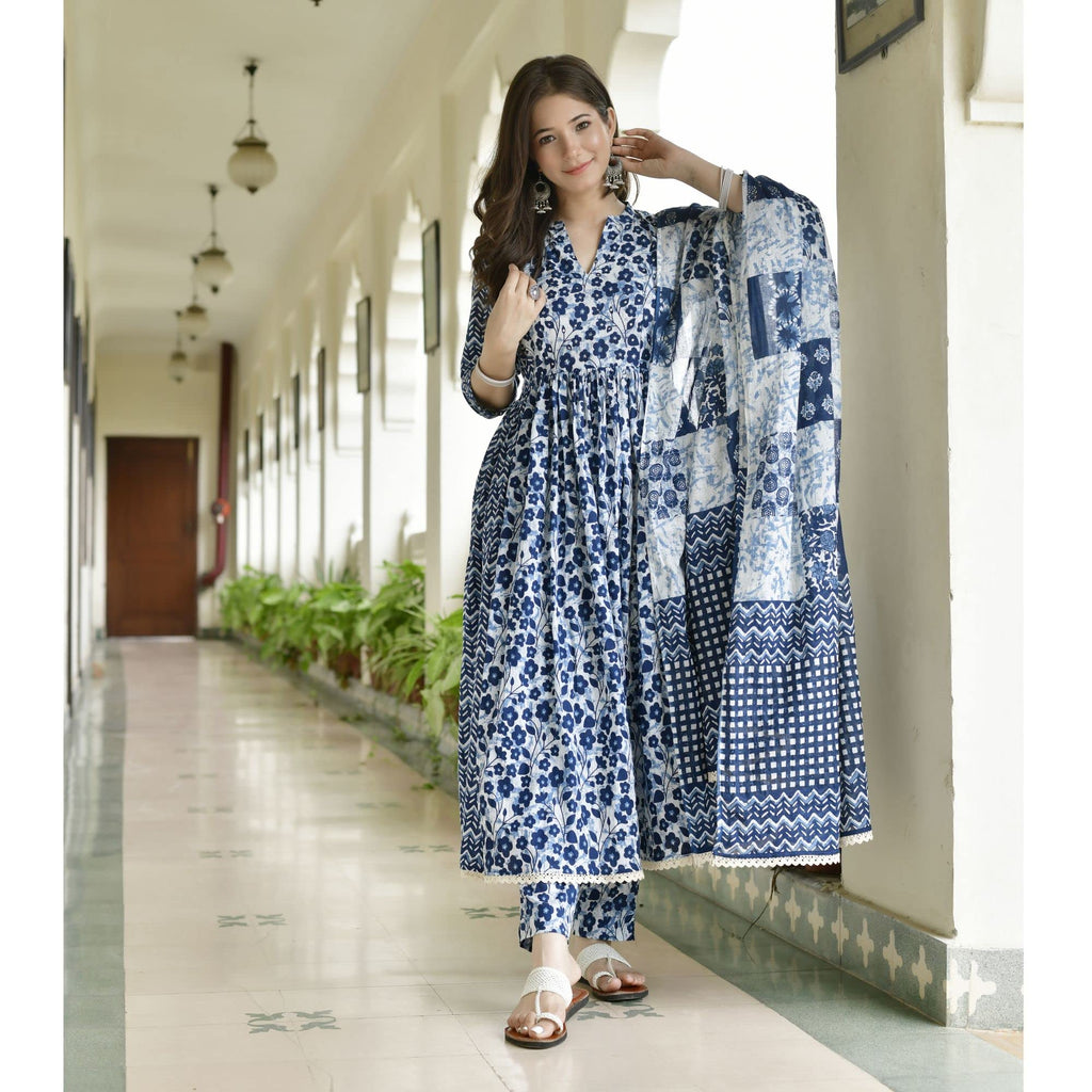 Gosriki Women'S Cotton Blend Anarkali Printed Kurta With Pant & Dupatta (Damini Blue-Gs_L_Blue_Large)