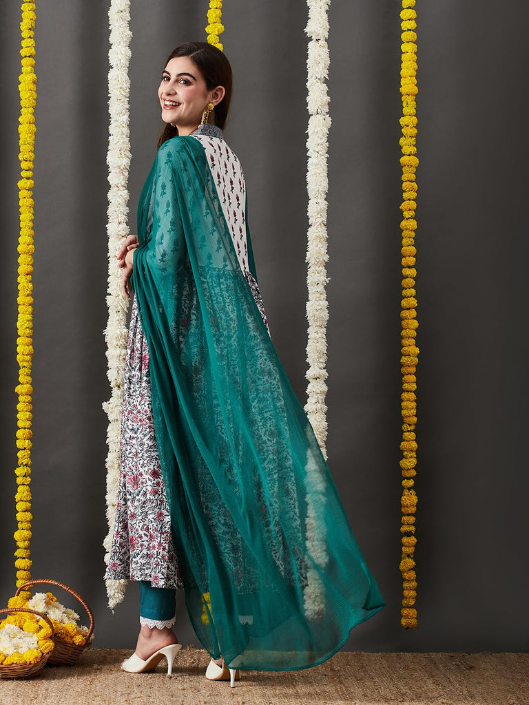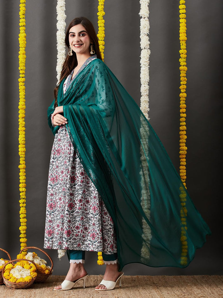 Gosriki Women'S Cotton Blend Anarkali Printed Kurta With Pant & Dupatta (Toki White Gs Xl White X Large)