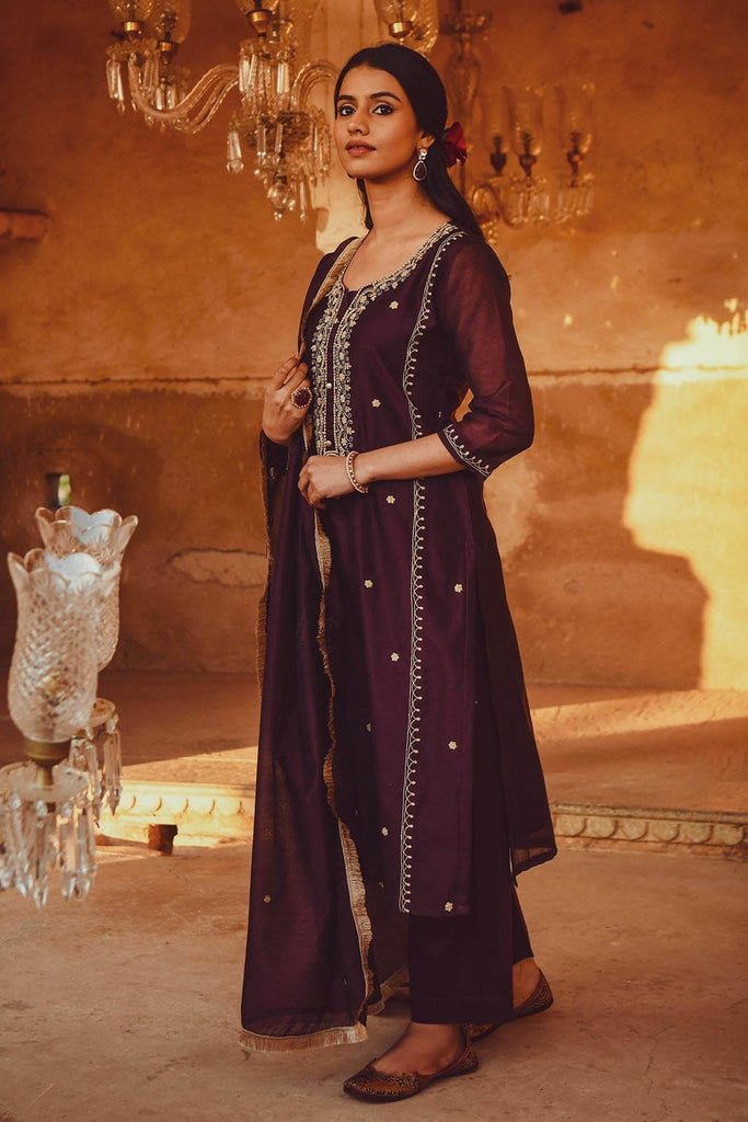 Gosriki Women'S Cotton Blend Embroidered Straight Kurta With Pant & Dupatta (Ultra101 Wine-Gs_4Xl_Wine_Xxxx-Large)