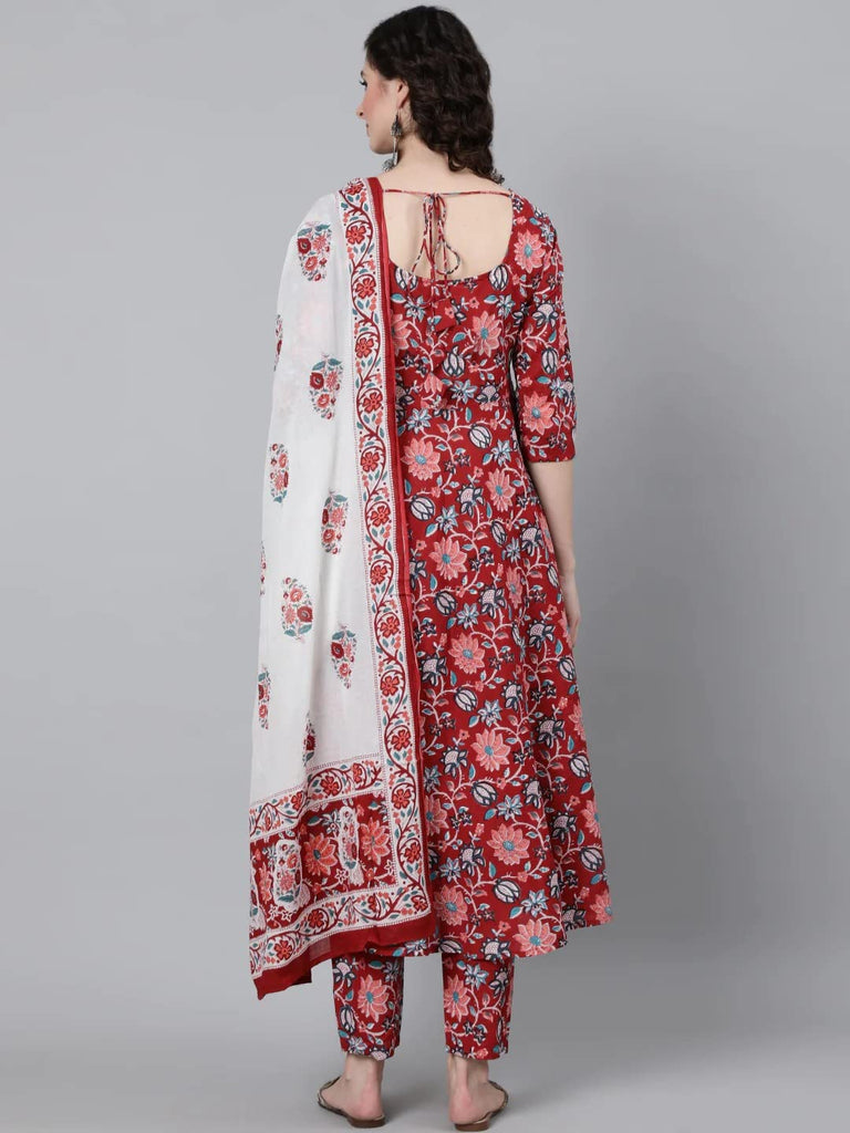 Gosriki Women'S Cotton Blend Floral Printed Anarkali Kurta With Trouser & Dupatta (Gym-Red-Gs_Xl_Red_X-Large)