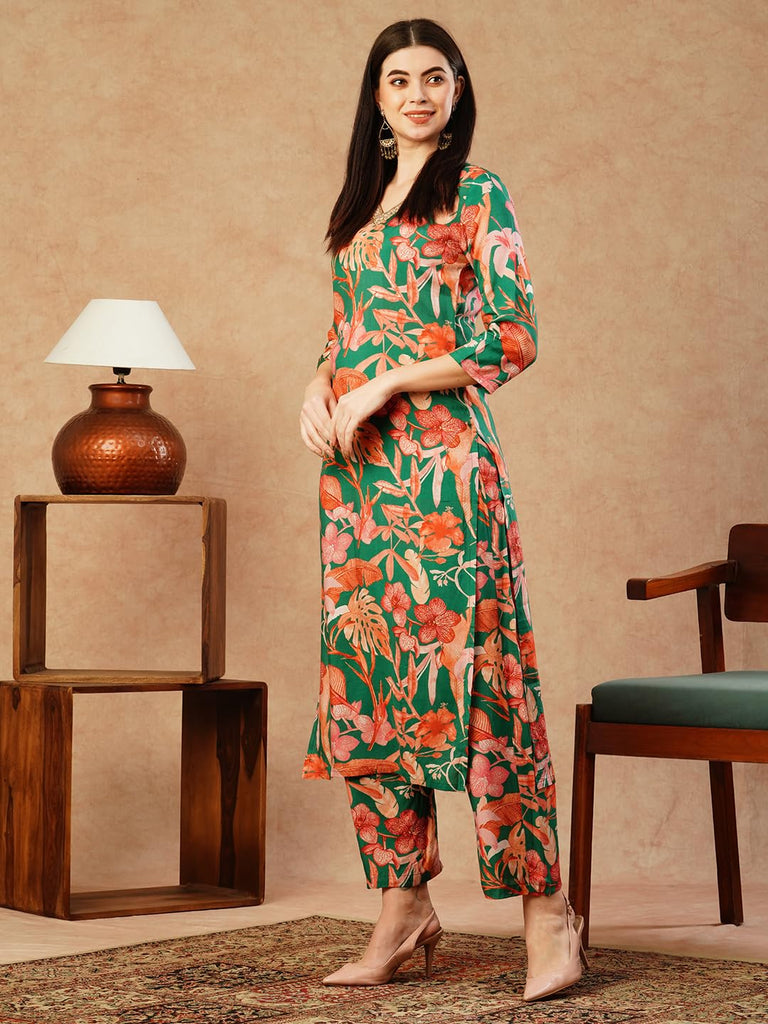 Gosriki Women'S Cotton Blend Straight Printed Kurta With Palazzo (Chinki Green-Nw-Gs_Xxl_Green_Xx-Large)
