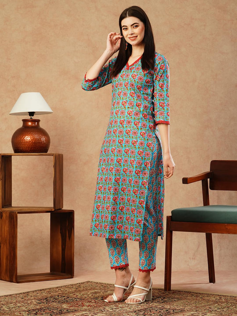 Gosriki Women'S Cotton Blend Straight Printed Kurta With Pant (Balajyoti Blue-Gs_M_Blue_Medium)