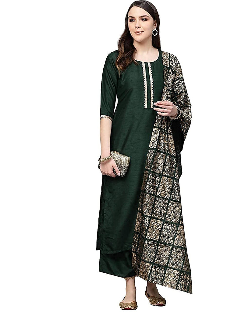 Gosriki Women'S Cotton Straight Solid Kurta And Palazzos & Dupatta(Sonari-New-Green_S-Green_Small)