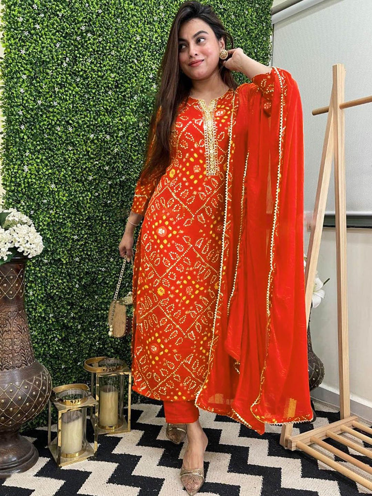 Gosriki Women'S Rayon Blend Straight Bandhej Printed Kurta With Pant & Dupatta (Turae Orange-Vks01-Gs_S_Orange_Small),Orange,,B0DJK1YVP4