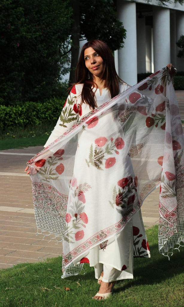Gosriki Women'S Rayon Blend Straight Printed Kurta With Pant & Dupatta (Kanegari White-Gs_L_White_Large),White,,B0DD76NPK1