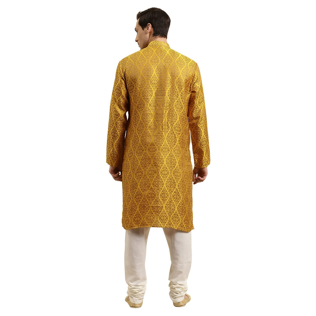 Sojanya (Since 1958 Men'S Jacquard Silk Mustard & Gold Kurta & Off-White Churidar Pyjama Set Size 40