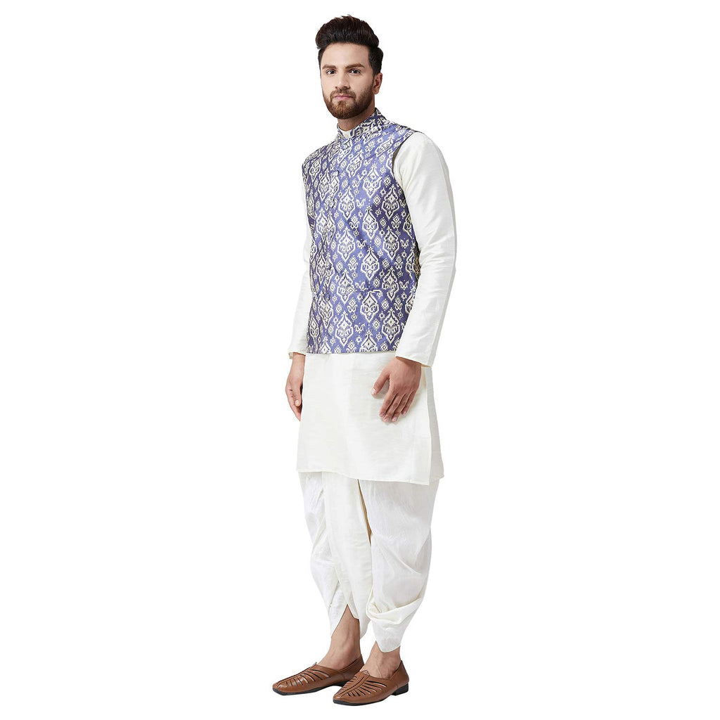 DescriptionSojanya As A Brand Brings You Quality And Affordability. In Market Since 1958, We Take Pride In Our Commitment To Maintain Quality Standards In Each Piece Manufactured By Us. A True Epitome Of Class, This Kurta Dhoti And Printed Nehru Jacket Combo Will Surely Reflect Your Impeccable Taste In Fashion. Made From Banarsi Dupion Silk Fabric, This Set Will Surely Make You The Cynosure Of All Eyes. Team This Kurta Dhoti Nehru Jacket Set With A Pair Of Mojris Or Kolhapuri Chappals To Give A Classy Touch To Your Ethnic Look. The Kurta Dhoti Is Made Of White Color Dupion Silk Fabric And With Blue Color Printed Silk Nehru Jacket Set.