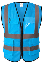 The vest comes in sky blue mesh, providing high visibility for safety in various environments.