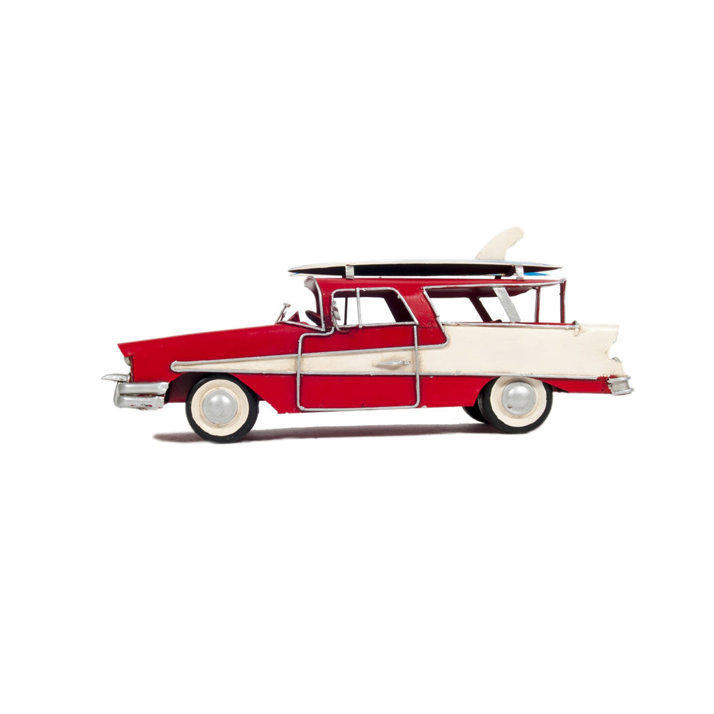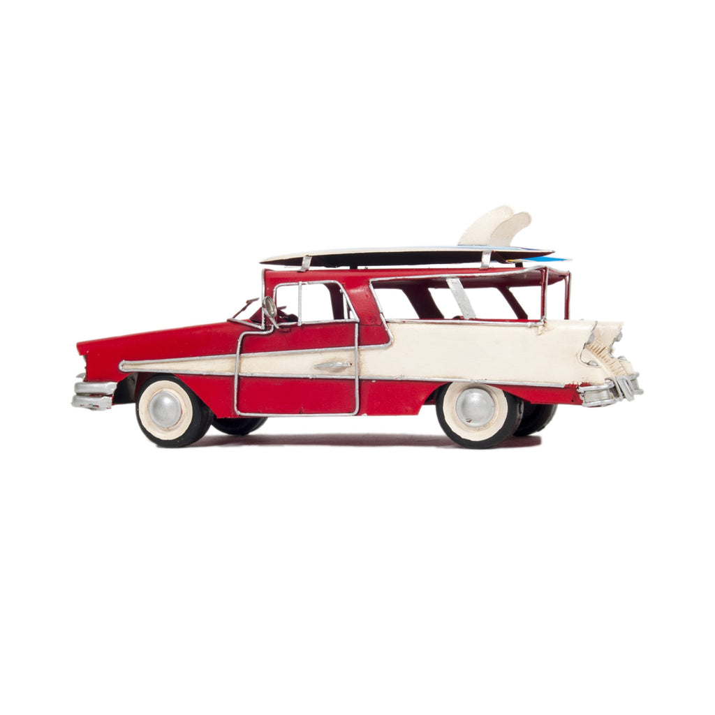 The model car is primarily crafted from tin, featuring metal wheels and securely welded-on surfboards, ensuring durability and authenticity.