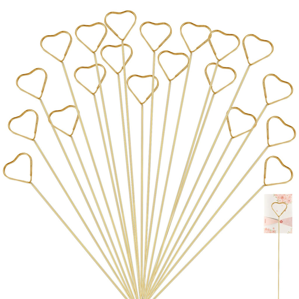 Heart Shape Floral Card Holder PicksThis place card holder is great to help you display wedding table cards, table numbers, pictures, photos, memo notes, paper menu, cake accessories decor and more.These card holder picks can help your bouquet to better fix the cards and help you convey the best wishes!Specification:Color: goldenMaterial: alloySize: 30cm/11.8inchQuantity: 20 piecesPackage includes:20 x Floral Gift Card HolderNote:Manual measurement, please allow little size errors.The colors shown on picture may be biased from the true color, please refer the real objects.