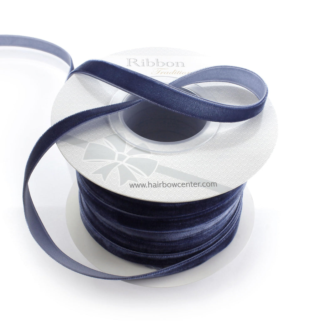 3/8 Velvet Ribbon - Navy, 5 Yards This narrow velvet ribbon measures 3/8 inch wide and comes in 5 Yards. Made from soft nylon velvet with a smooth finish, it is suitable for sewing, gift wrapping, and crafting projects. The Navy color provides a versatile shade that coordinates with many themes. Easy to cut, tie, and attach with glue, thread, or wire, this ribbon is ideal for bows, trim, floral arrangements, and decorations.