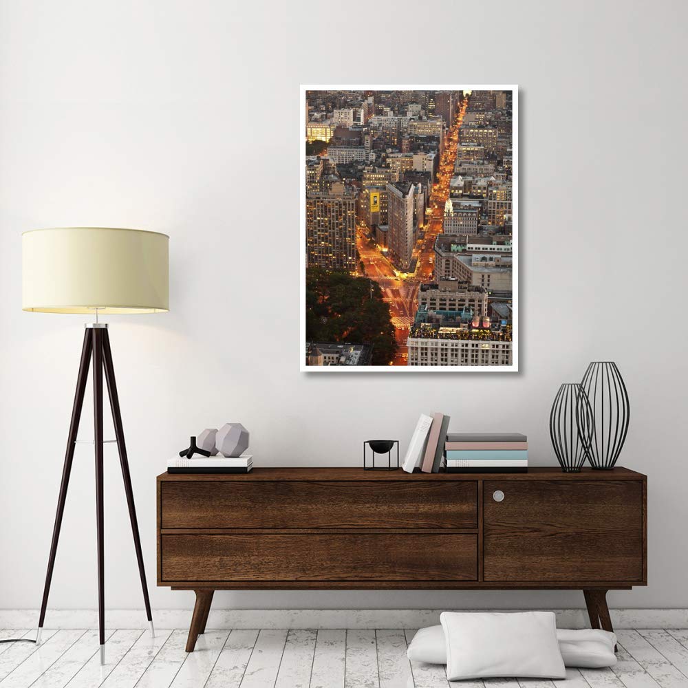 The artwork showcases an aerial view of the Flatiron Building, highlighting its iconic architectural design in an urban setting.
