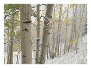 The artwork primarily features white snow and various shades of green and yellow from the aspen trees.