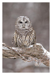This product is a paper art photograph featuring a Barred Owl in a winter setting.