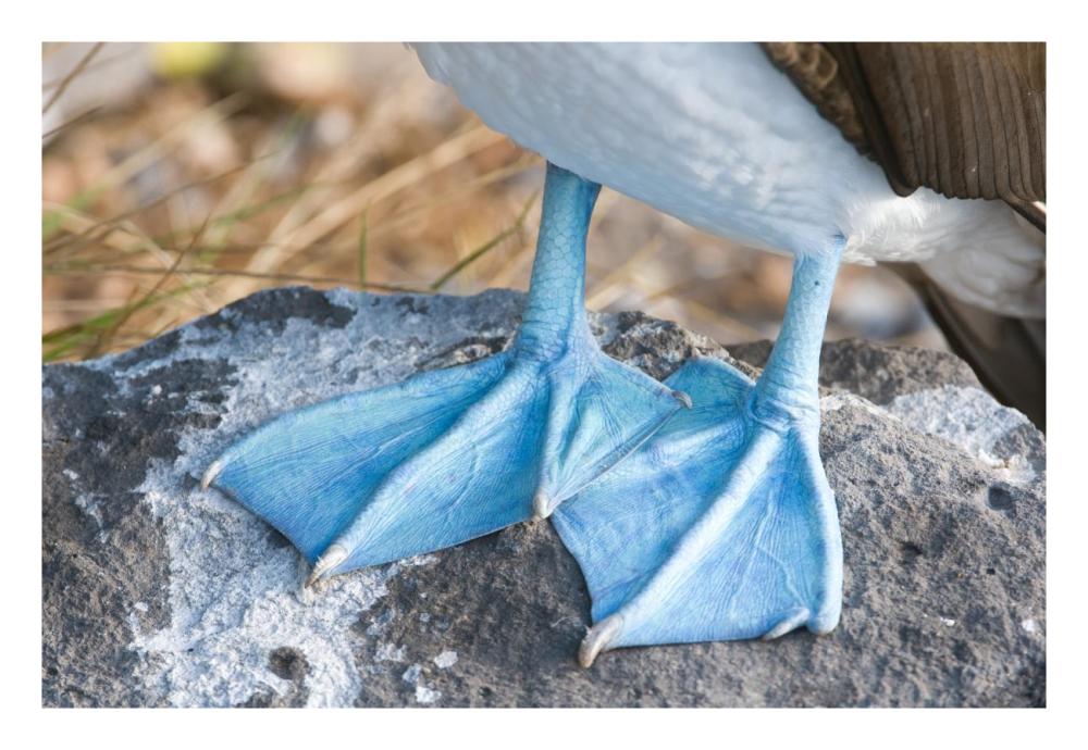 The photograph features Blue-Footed Booby feet from the Galapagos Islands, Ecuador.
