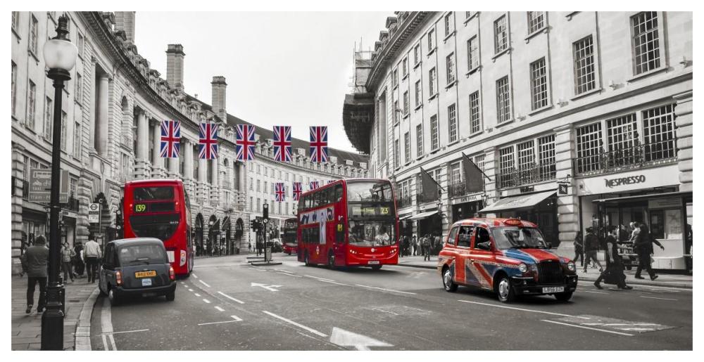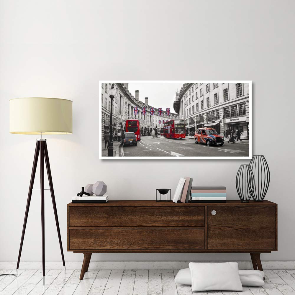 The artwork features themes of urban life, specifically focusing on buses and taxis in a London setting.