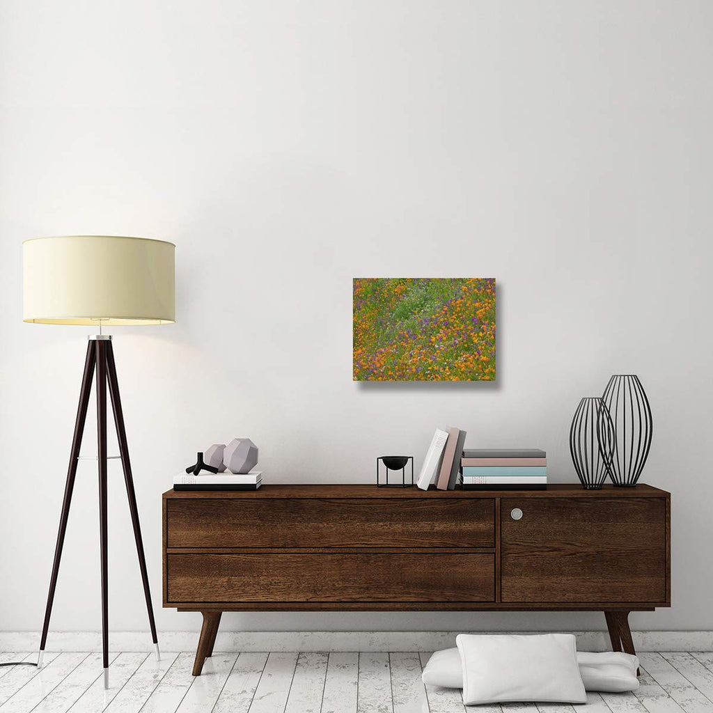 This artwork is a photograph depicting California poppies and desert bluebells carpeting a spring hillside.