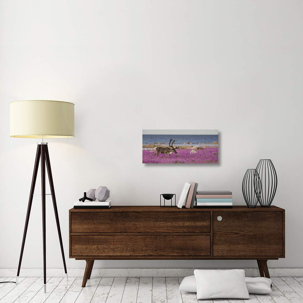 This artwork is a photographic canvas print featuring a caribou in a natural setting, specifically in a field of fireweed.