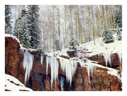 It is a paper art photograph depicting a frozen waterfall in the San Juan Mountains of Colorado.
