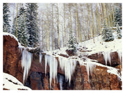 The theme of the photograph captures a frozen waterfall in winter, set in the San Juan Mountains of Colorado.
