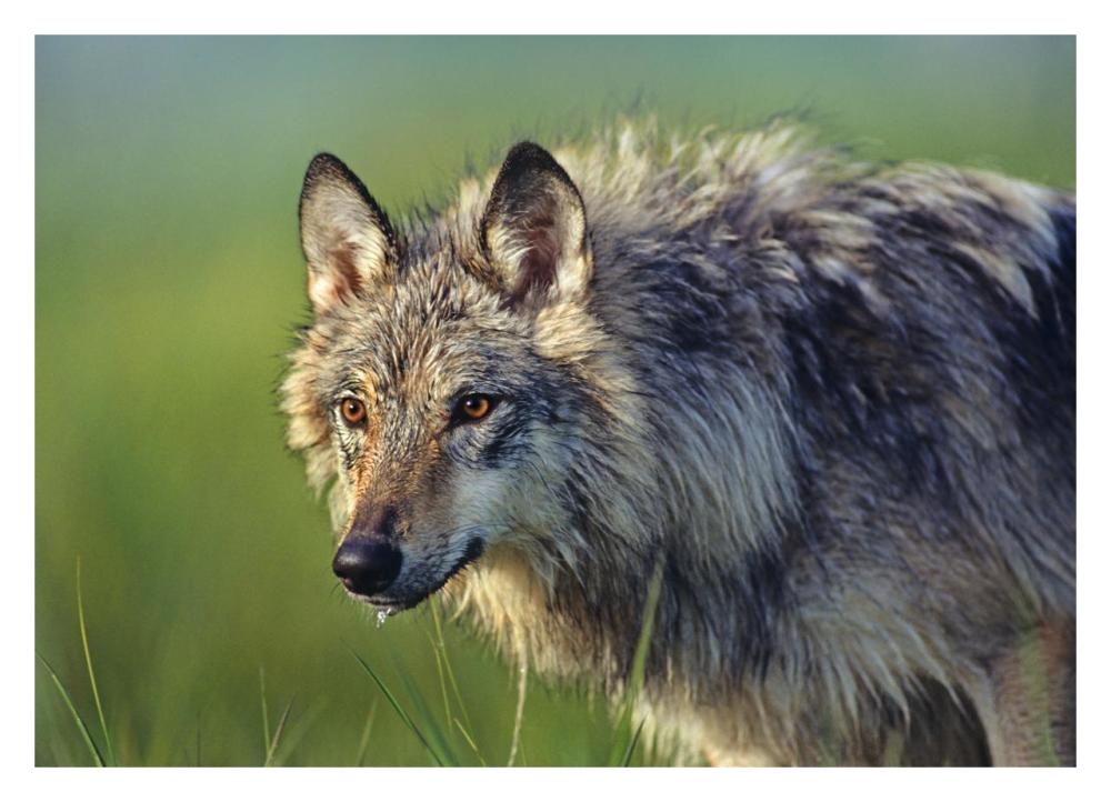 The artwork features a gray wolf, a species native to North America, depicted in a stylized artistic format.