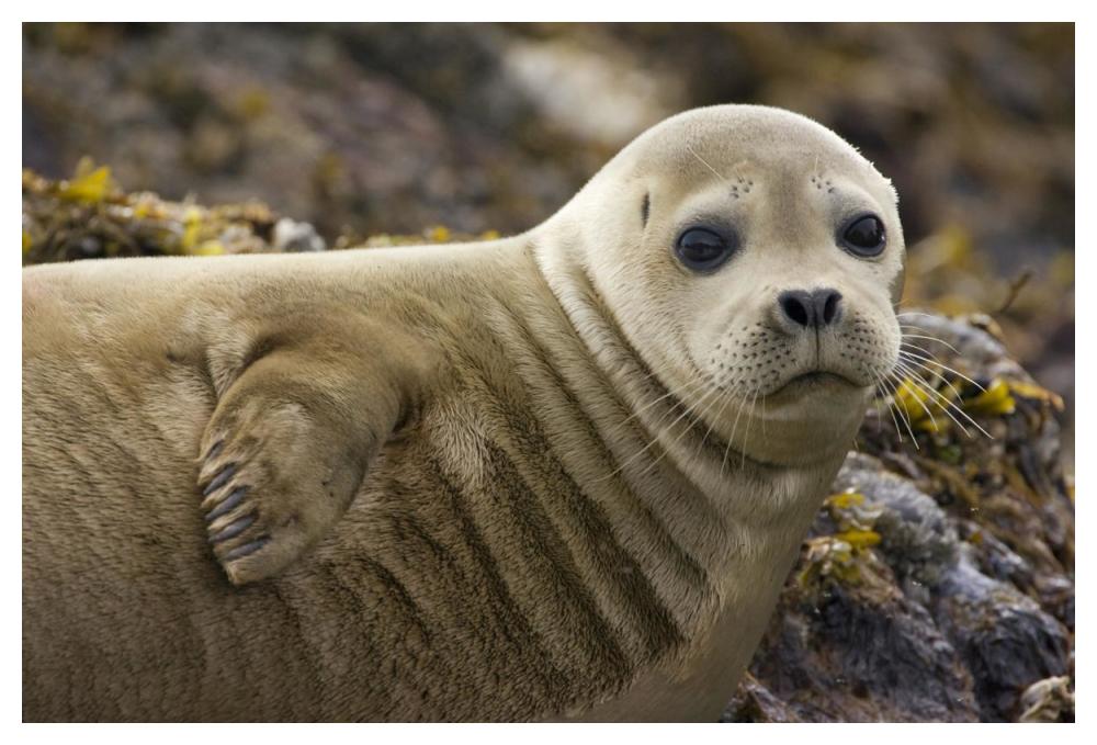 The harbor seal portrait can complement coastal, nature-themed, or wildlife decor styles.