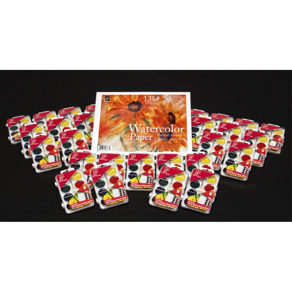 The set includes a 50 sheet pack of 135# watercolor paper, which is ideal for sharing among students or artists.