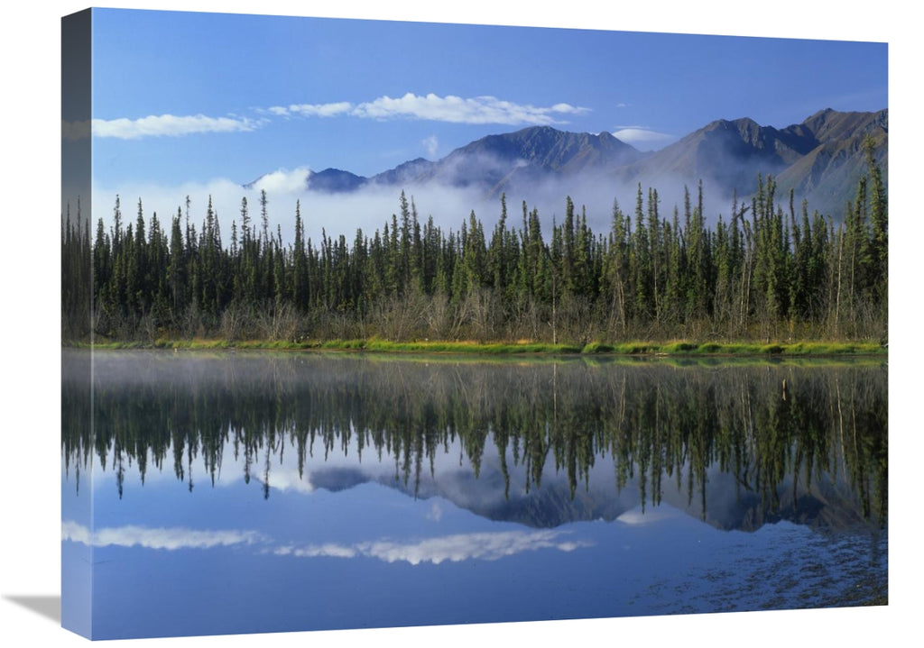 This product is a canvas art print featuring a scenic photograph of a lake reflecting a mountain range and forest in Kluane National Park, Yukon, Canada.