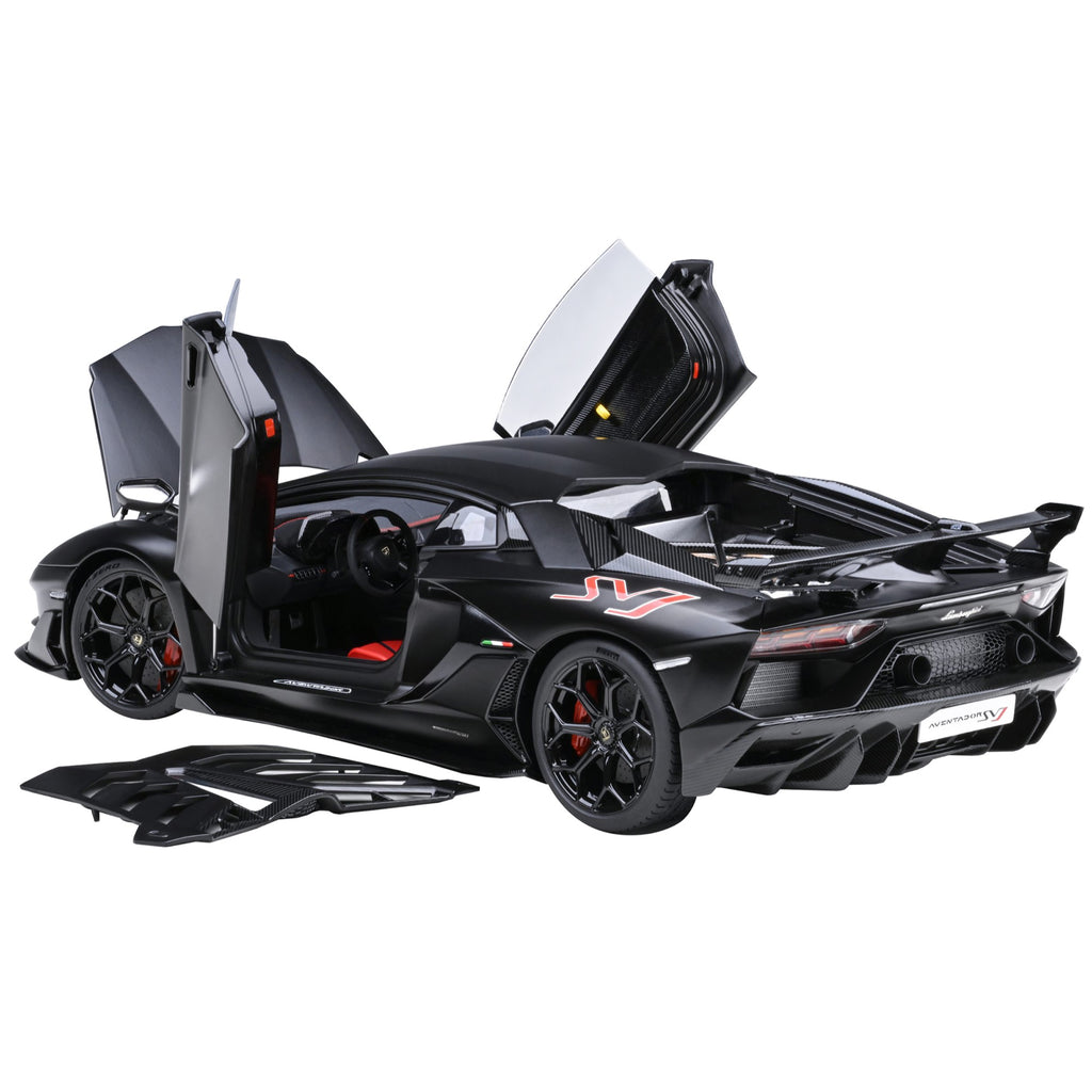 Brand New 1/18 Scale Car Model Of Lamborghini Aventador Svj Nero Nemesis Matt Black Model Car By Autoart. Carpeted Interior. Real Rubber Tires. True-To-Scale Detail. Has Steerable Wheels. Officially Licensed Product. This Model Is Made Of Composite. Manufacturer'S Original Unopened Packaging. Detailed Exterior, Interior, Engine Compartment. Opening Frunk, Doors And Engine Compartment. Dimensions Approximately L-10.75, W-5, H-2.25 Inches.