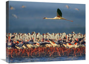This artwork is a canvas print featuring a Lesser Flamingo flying over a flock, set against the backdrop of Lake Nakuru, Kenya.