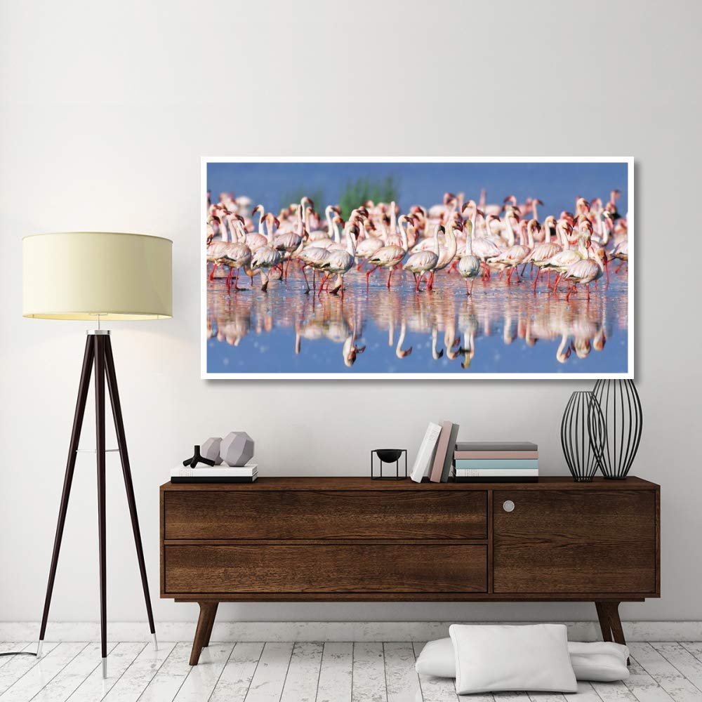 The Global Gallery Lesser Flamingo art piece measures 74 inches by 38 inches.