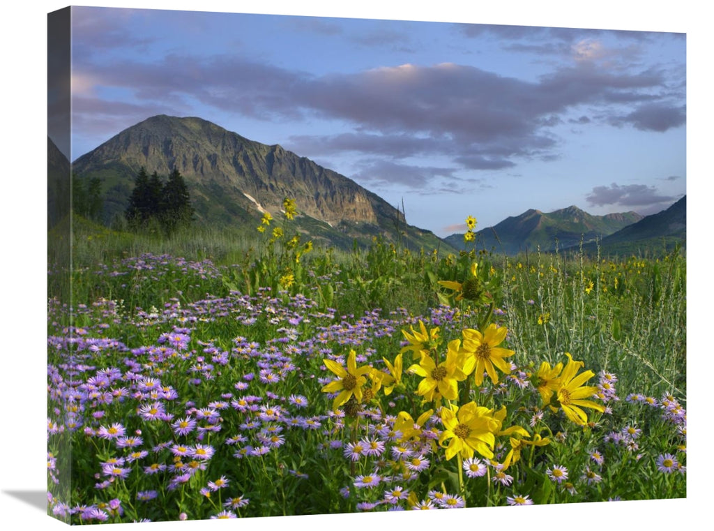 This artwork is a canvas print featuring a landscape photograph of the Meadow of Orange Sneezeweed and Smooth Aster, with Gothic Mountain in the distance.