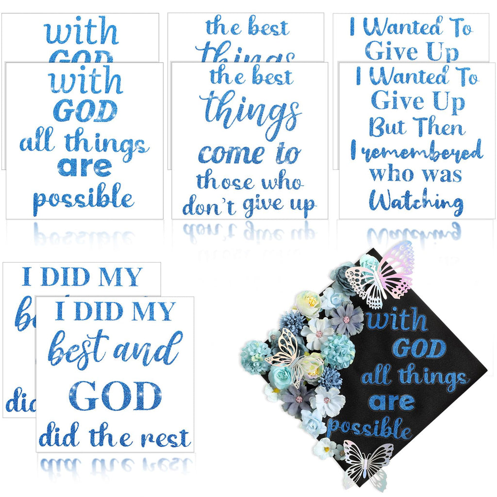Features: Decorating your graduation cap through our cap decorations for glitter sticker is a symbolic act of displaying your personality and style. Our graduation decoration set lets you leave a practical imprint as you bid farewell to your academic journey. Whether you stick to traditional designs or venture into something innovative, your decoration would ensure unforgettable moments and cherished memories Specifications: Material: PVC Color: blue Package includes: 8 x Graduation cap decoration glitter stickers Notes: Manual measurement, please allow slight errors on size. The color may exist a slight difference due to different screen displays. Our products have strong adhesive, please do not stick them on the paper cabinet, paint cabinet, in case of damage to the furniture.