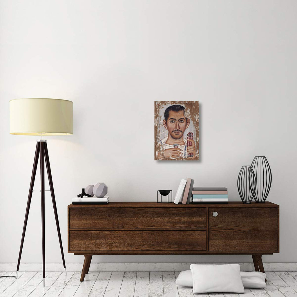 It is a canvas art piece featuring a photograph of a mummy portrait.